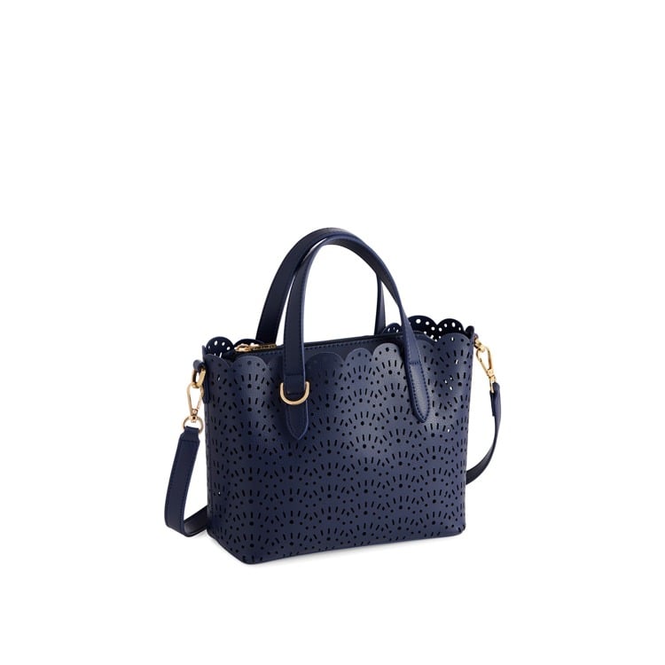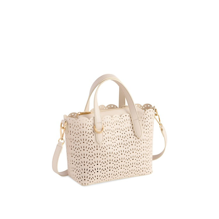 Chic and charming, the Shiraleah Lola Mini Tote features scalloped edges and an eye?catching cut?out design that stands out with ease. With double top handles, an adjustable detachable strap, and a removable zip pouch, it’s perfect to organize tote bag essentials from wallet to phone in stylish comfort. Structured and versatile, it’s the ideal go?anywhere companion for brunch or beach days.