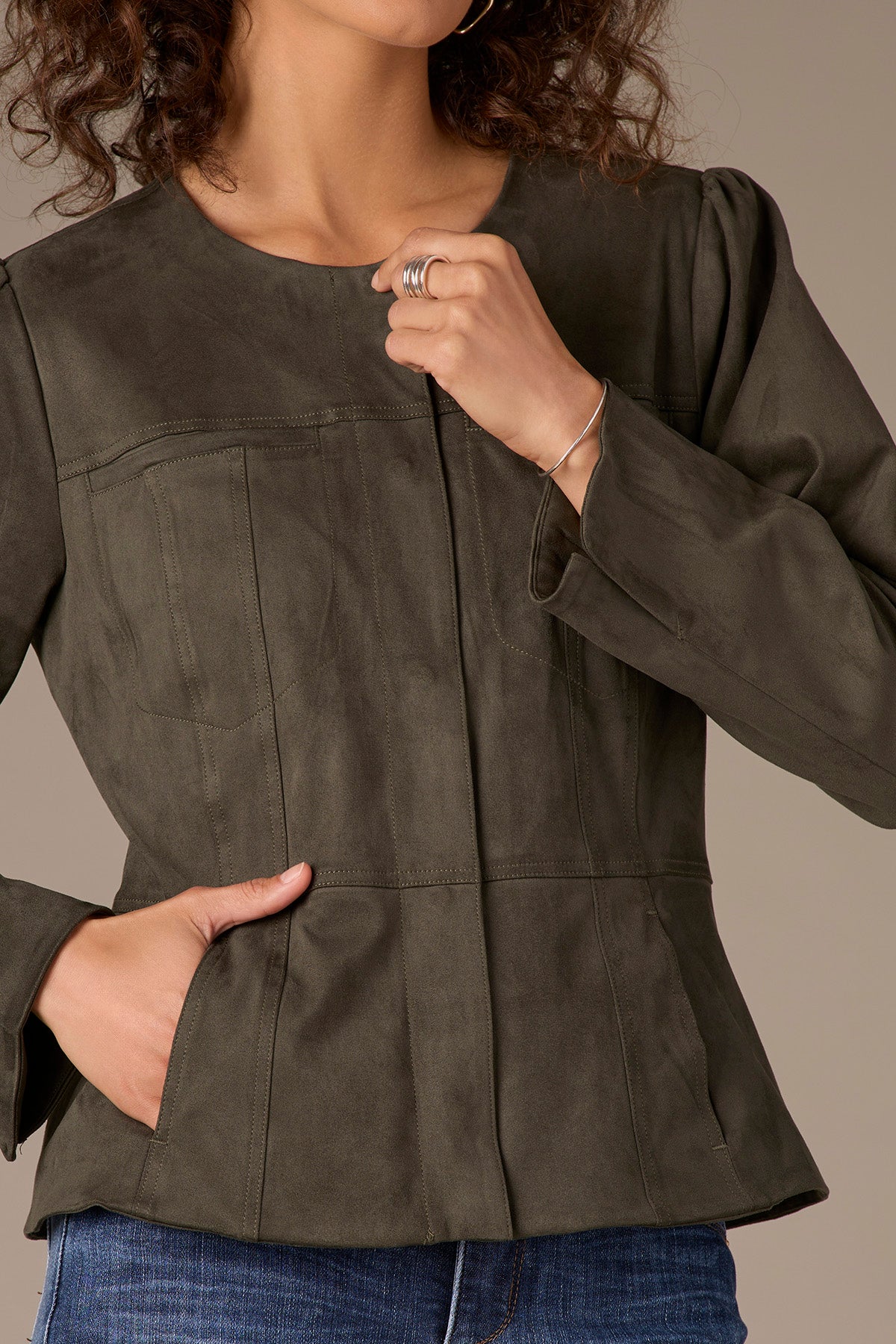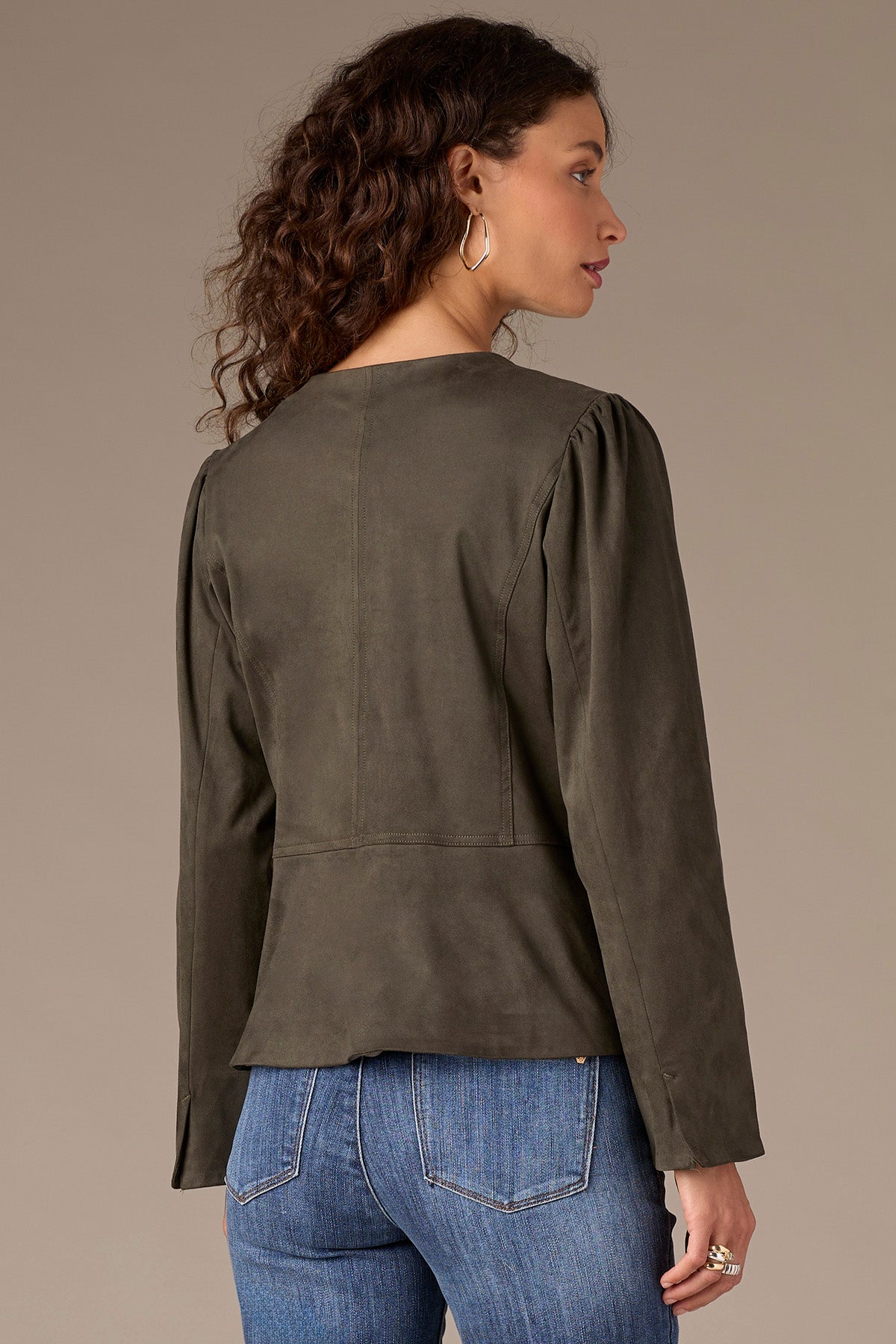 Long Sleeve Collarless Peplum Jacket W/ Hidden Snaps