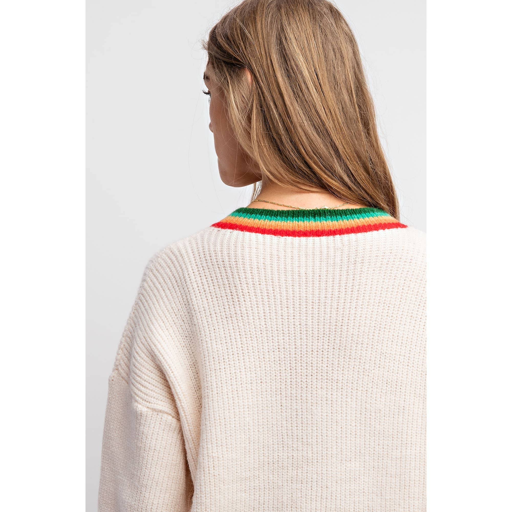 This sweater makes the perfect addition to THIS HOLIDAY. - Colorful contrast rib patch works on letter patterns - Made in medium-weight knitting - Loose fit with contrast rib bands on bottom hems - Crew neckline with wide rib neck band - Model in heather grey is 5' 8" 32-23-34 and wearing a Small