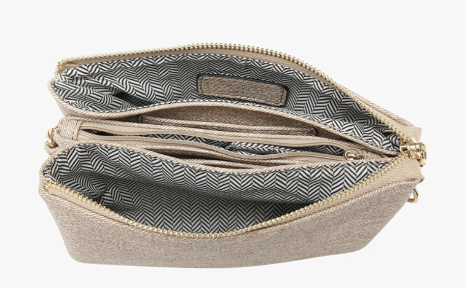 - Versatile crossbody/clutch with two major compartments and a middle zipper pocket for organization.
