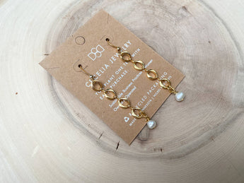 These stunning dangle earrings feature delicate gold-plated link chains that create a fluid and graceful movement. Each earring is finished with a luminous pearl accent, adding a touch of timeless sophistication. Perfect for special occasions or elevating everyday looks, these earrings blend modern elegance with classic charm.