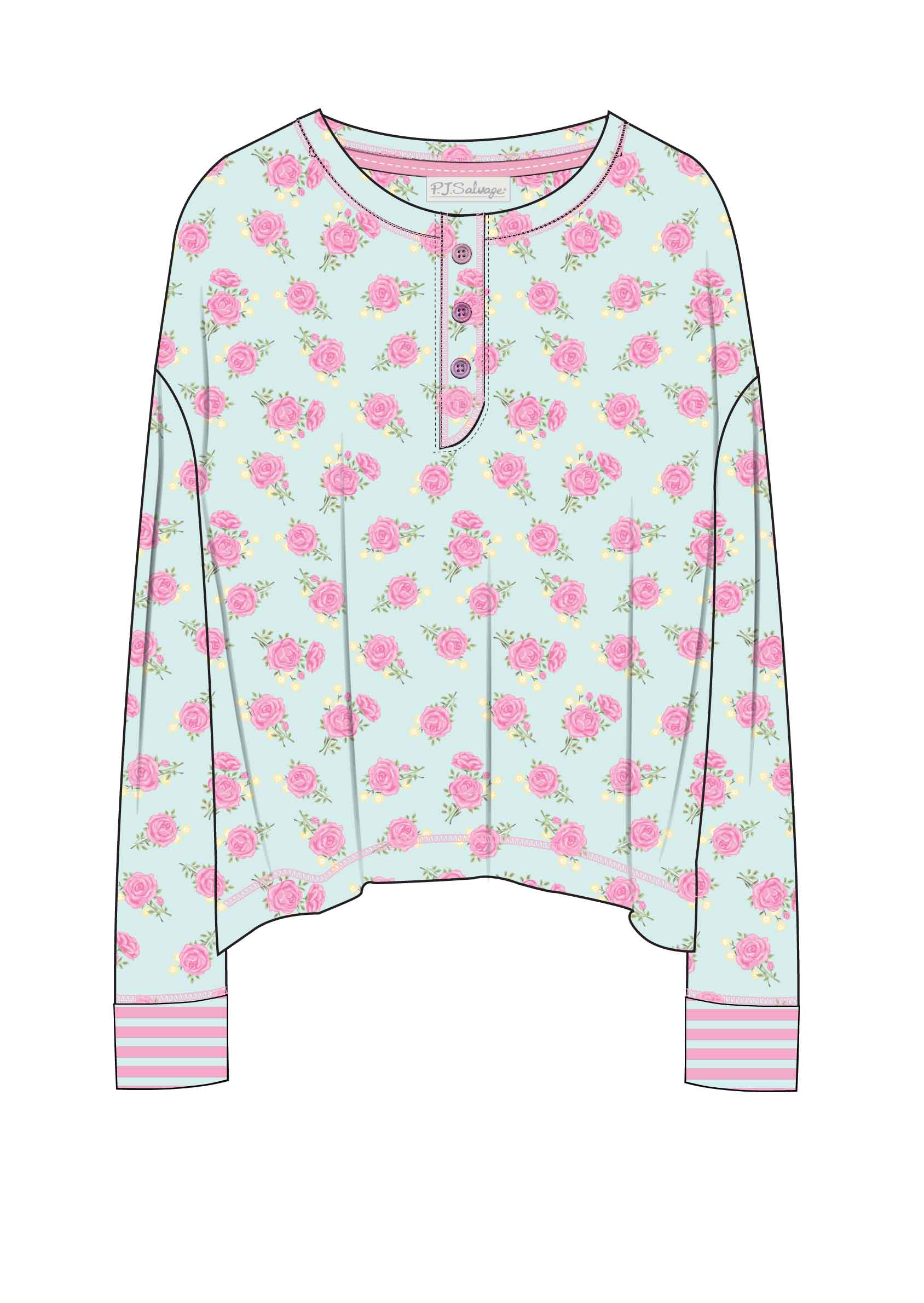Step into serene comfort with the PJ Salvage Long Sleeve Secret Garden top, featuring a soft fabric adorned with delicate floral prints that evoke peaceful beauty. Perfect for lounging or casual days, its relaxed fit combines cozy warmth with feminine charm. Elevate your wardrobe with this women’s floral long sleeve top, designed to bring elegance and comfort to everyday wear.