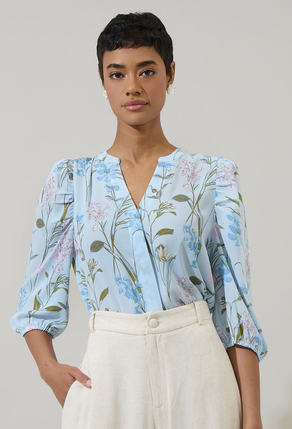 Kick off your weekend in the Leida Floral Maly Pleated Midi Dress. Floral clusters cast shadows that lay against a light blue background. The print shapes this long sleeve design with v-neckline and button up front. It maintains a relaxed fit throughout and can easily be worn out or tucked in.