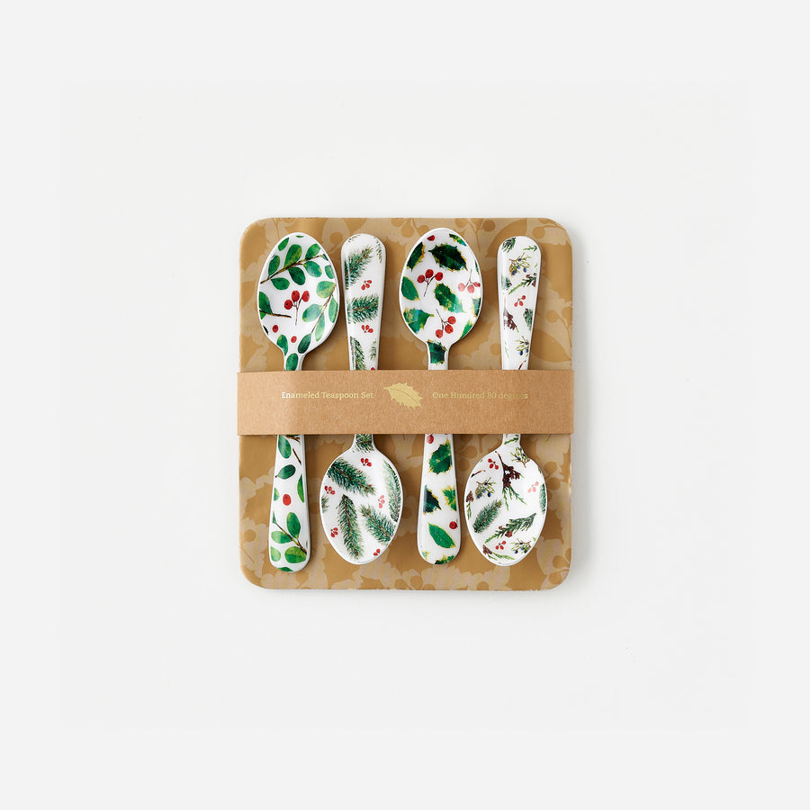 Elevate your table settings with the One Hundred 80 Degrees Botanical Spoon set. Crafted from enameled metal, each spoon in this set of four showcases intricate botanical designs, adding a touch of nature-inspired elegance to your dining experience. Perfect for serving condiments, spreads, or desserts, these spoons are both functional and decorative. Packaged with a gift card, they make an ideal present for nature enthusiasts and culinary aficionados alike.
