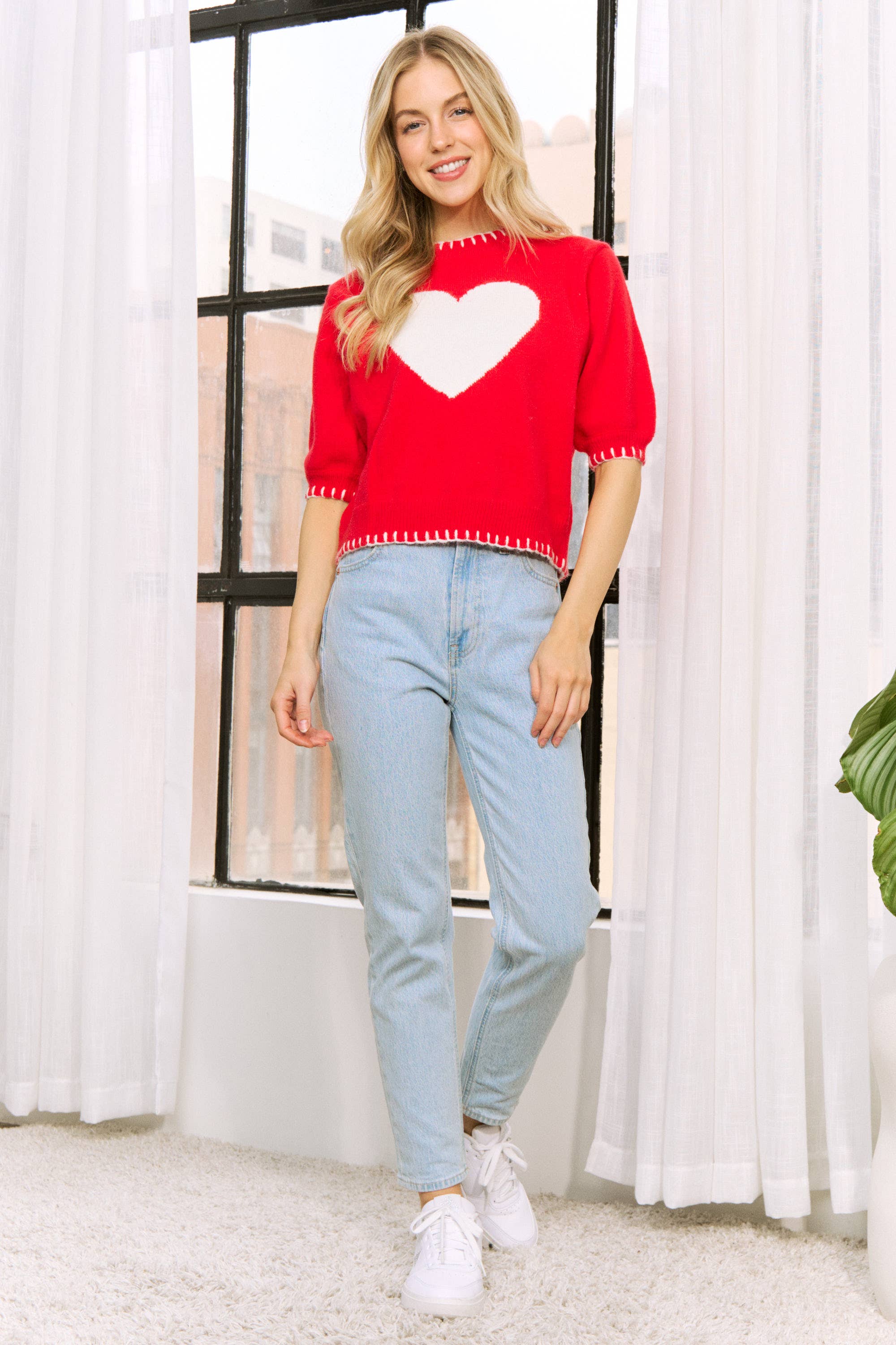 Medium-weight soft knitting sweater - Colorful HEART jacquard relaxed fit design - Rib bands on bottom, neckline and sleeves - Half sleeve length