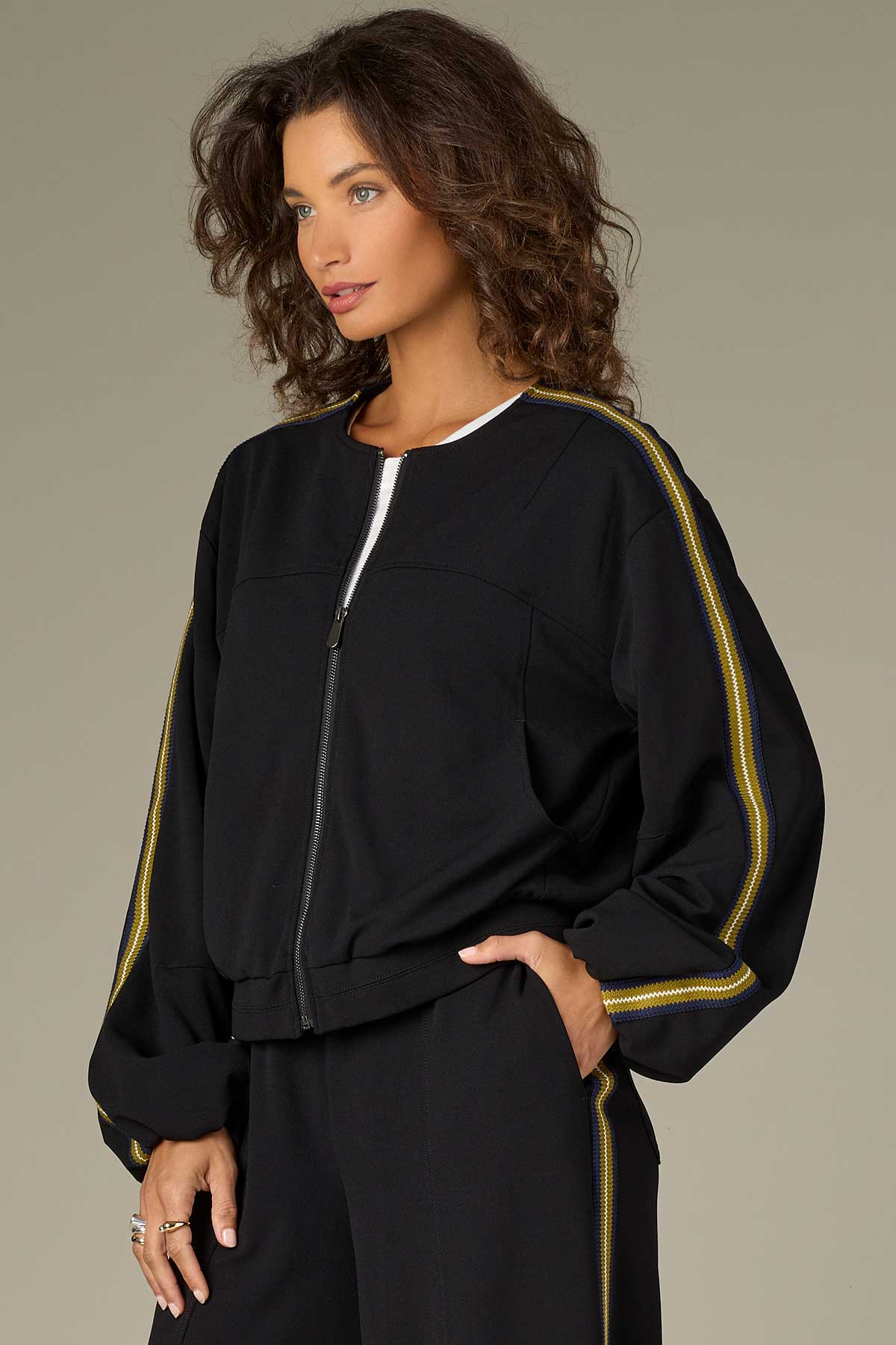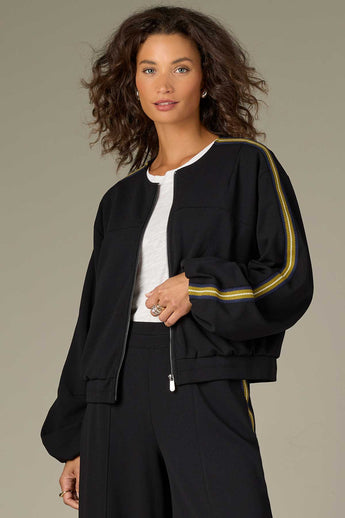 The Wit and Wisdom Long Blouson Sleeve Drop Shoulder Jacket brings sporty sophistication to your everyday style. This women’s casual stripe trim jacket features soft blouson sleeves, a relaxed drop-shoulder design, and chic stripe detailing for a modern edge. Perfect for layering, it adds effortless polish to jeans, dresses, or trousers. A versatile wardrobe essential that combines comfort, confidence, and timeless appeal in one elevated piece.