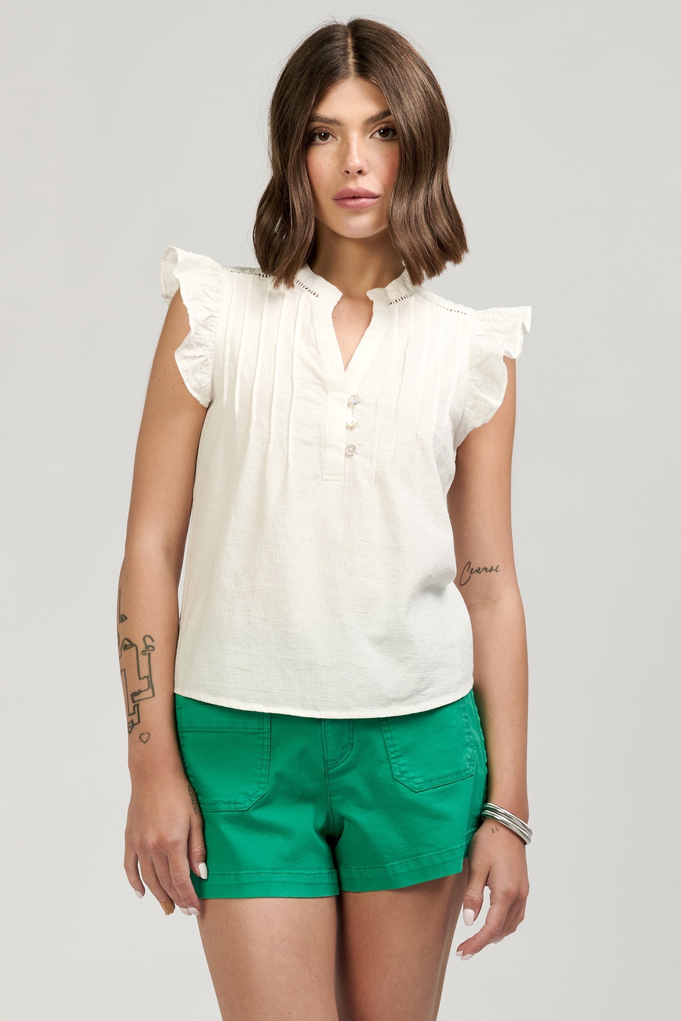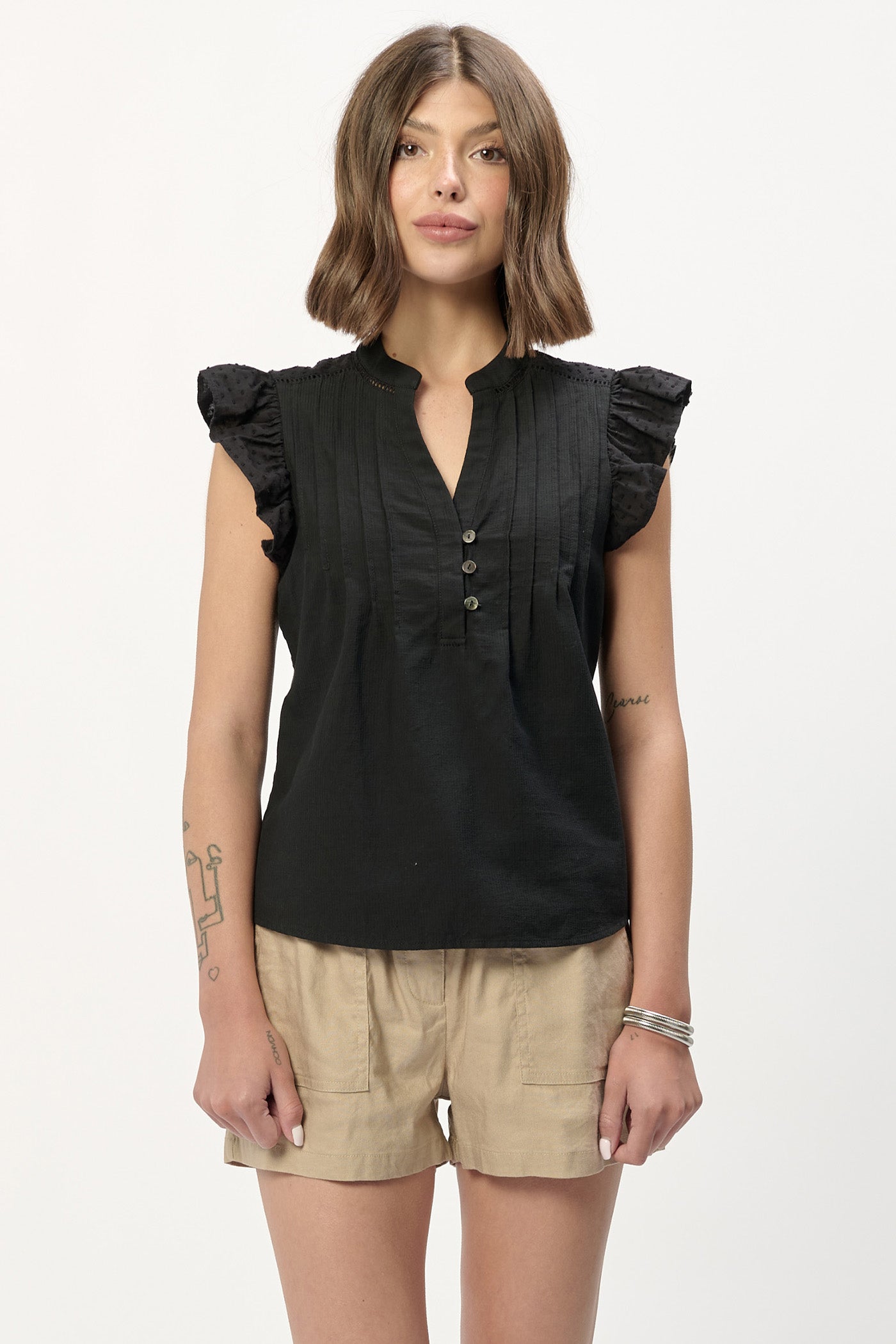 Analia Flutter Sleeve Top W/Lace Trims