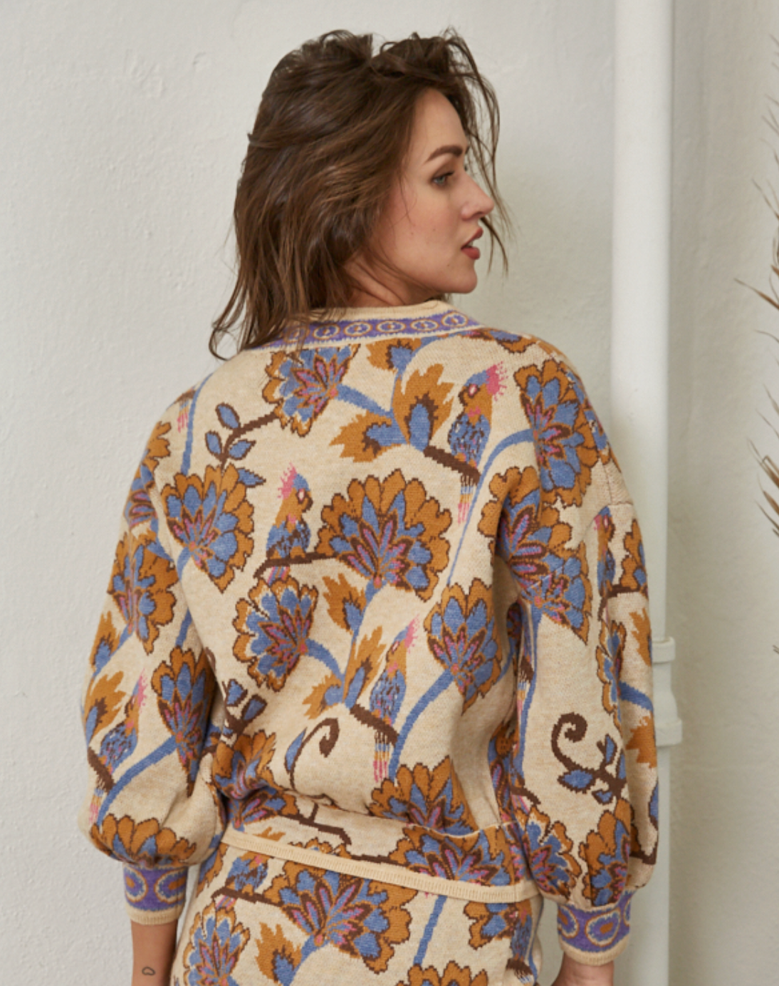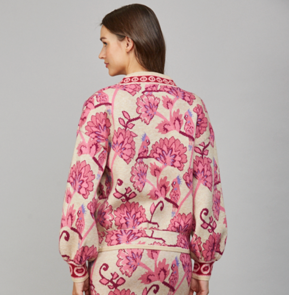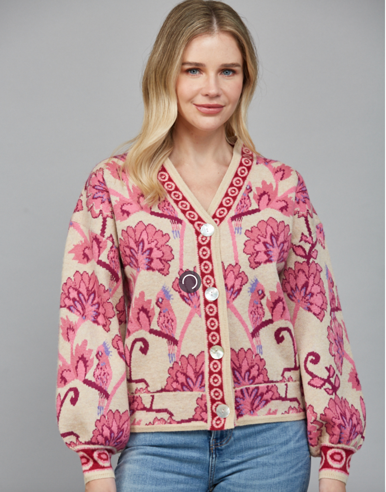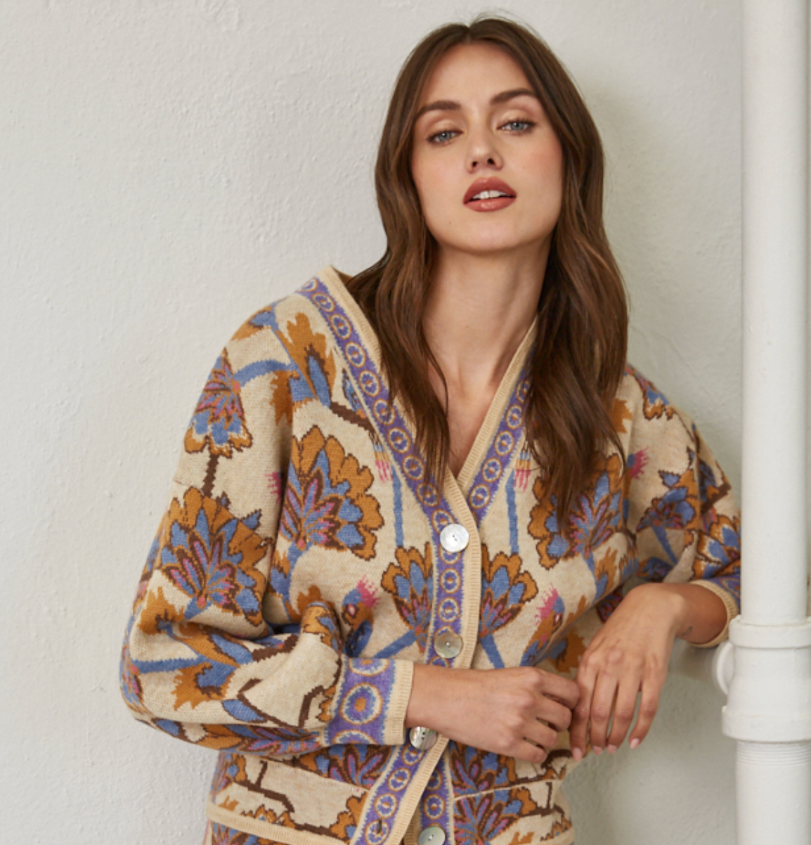 FLORAL PATTERN JACQUARD KNIT V-NECK BUTTON CLOSURE CARDIGAN