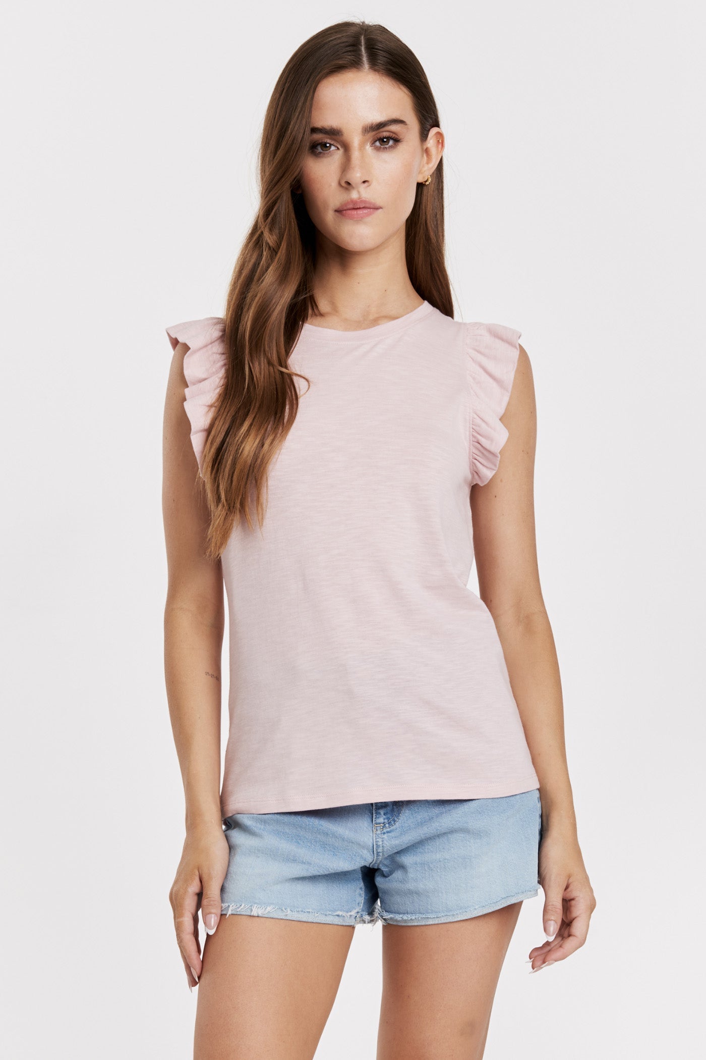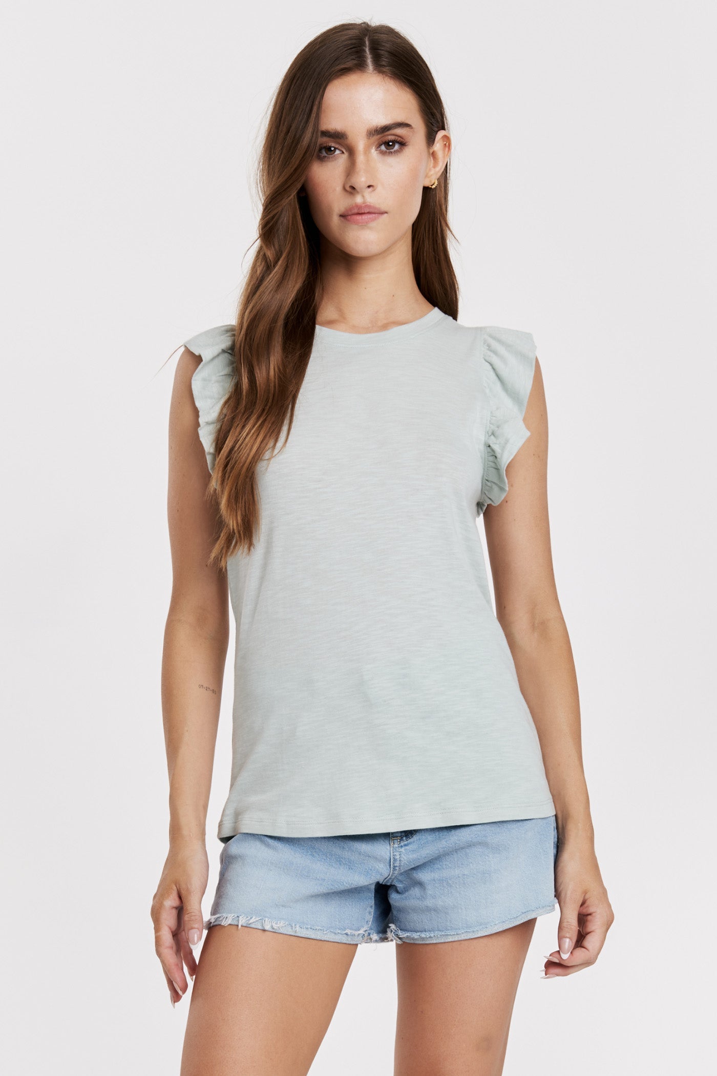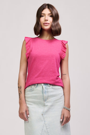 The North Ruffle Trimmed Sleeve Slub Tank is a perfect mix of comfort and style. Crafted from soft slub fabric, it features delicate ruffle-trimmed sleeves that add a touch of femininity to a casual silhouette. Versatile and easy to wear, the ruffle trimmed slub tank is ideal for layering or wearing solo on warmer days.